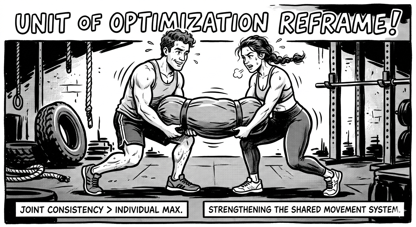 That does not mean every workout needs to be shared. It does mean some of the week should be designed at the couple level, not only the individual level.